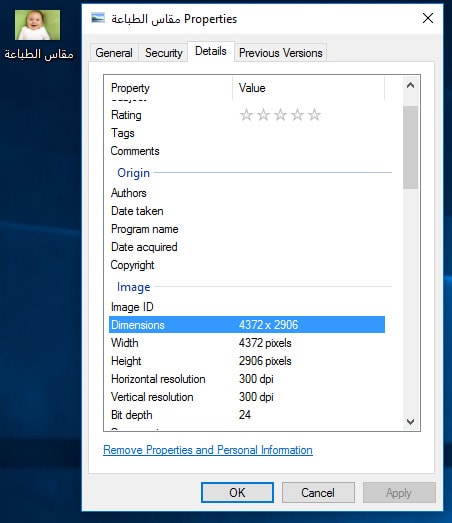 قم برفع الصورة إلى جهازك (سواء بنسخها مباشرة من الكمرة أو الهاتف الذكي أو بإرسالها بالإيميل من الهاتف الذكي). قم بالخطوات التالية: إضغط على الصورة بزر الفأرة الأيمن >>> أختر خصائص >>> من النافذة المفتوحة إختر تفاصيل >>> قم بالنزول للأسفل لترى الطول والعرض بالبيكسل.