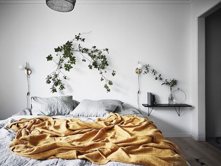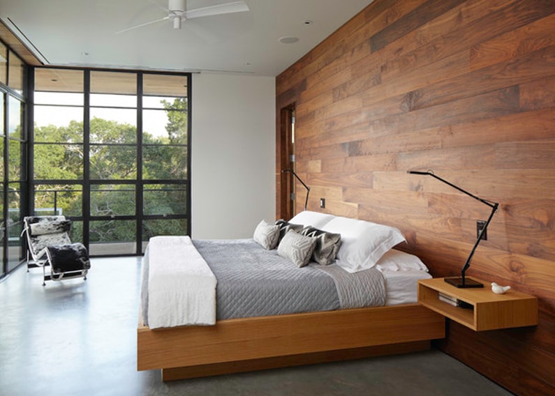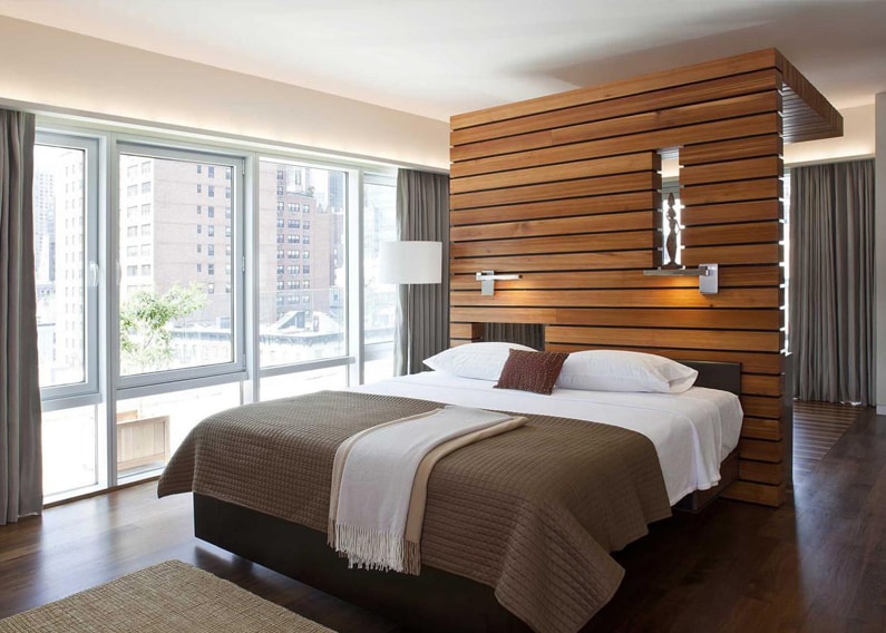 لا تنسى الشرائح الخشبية – شاع استخدام الشرائح الخشبية (Wood Slats) في ديكورات جدران المنازل كأبرز ملامح الديكورات العصرية. وإن كان غالبا ما تستخدم الشرائح الخشبية كحاجز أو فاصل بين الغرف مثلا، لا مانع من استخدامها مباشرة على الحائط أو في خلفية السرير.