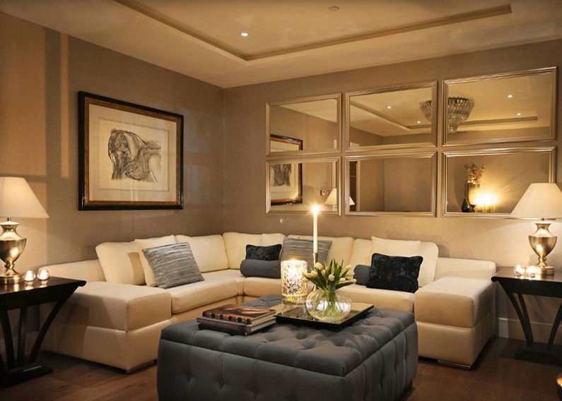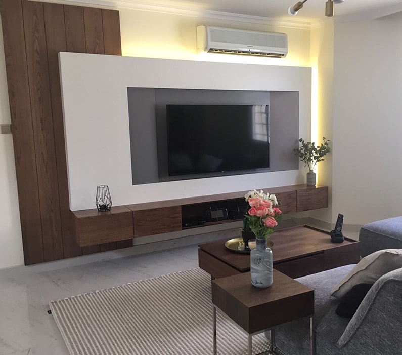 إضافة إضاءة مخفية خافتة سيزيد من جمالية الديكور وإضافة خزانة عرضية سوف يجعل لوحة التلفاز أكثر عملية.
