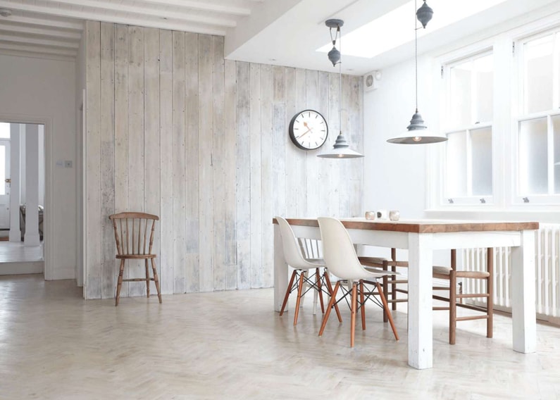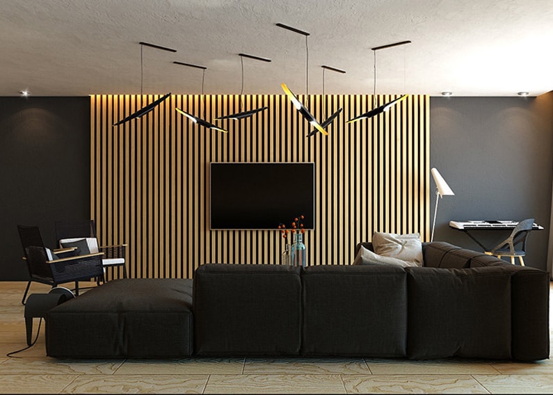 الشرائح الخشبية باللون الفاتح تبدو مذهلة على الجدران بألوان غامقة، مثل الجدران باللون الأسود والكحلي.