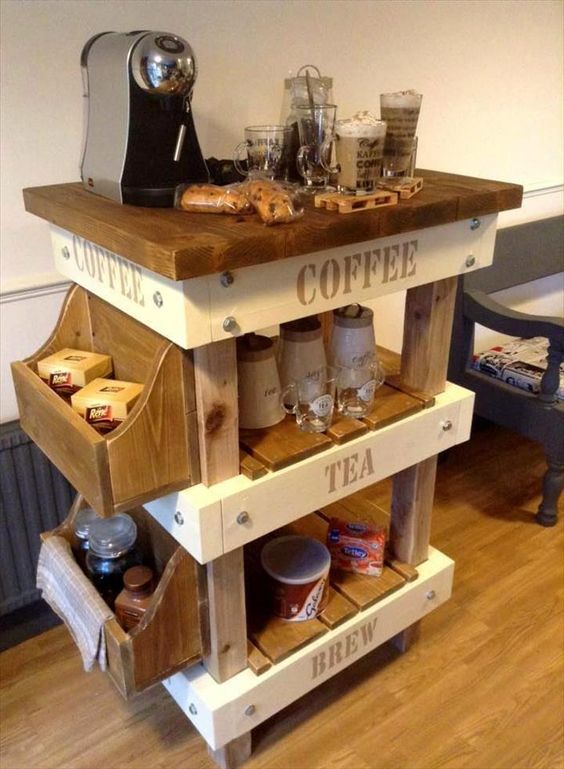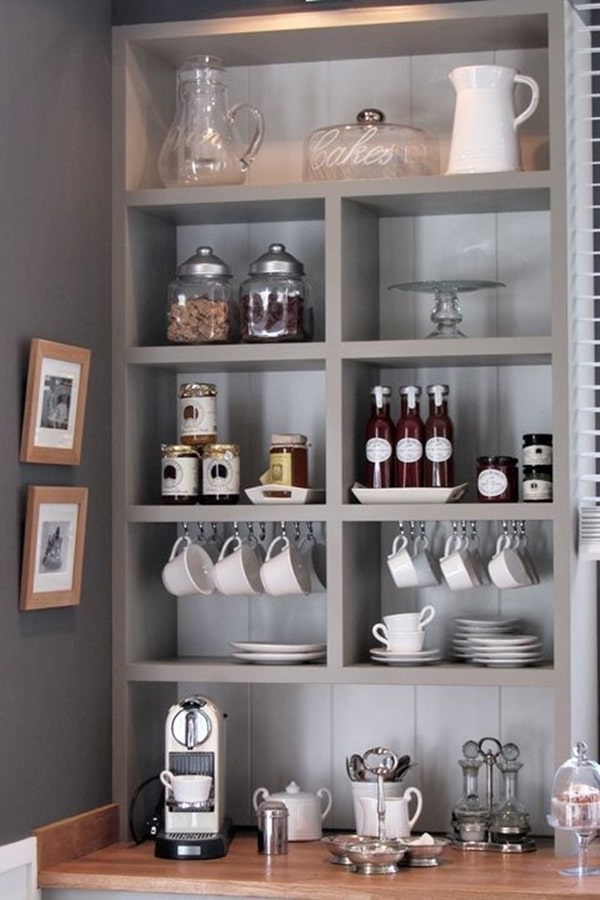 إذا كنت محدودا بمساحة ضيقة، هذه الفكرة قد تكون مثالية لك. كل ما تحتاجه لتطبيق هذه الفكرة هو مساحة إضافية على الحائط تجنبك تلك الفوضى على طاولة القهوة. العلب الصغيرة تبدو أكثر من رائعة بينما توفر مساحة لتخزين حبوب القهوة والشاي.