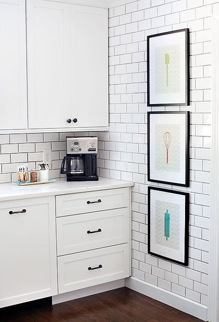 في هذا المثال، استخدام قضبان حديد باللون الأسود نتج عنه تباين ألوان مثالي مع الجدران البيضاء. يمكنك إضافة بعض الشخصية لهذه الفكرة بتعليق لوحة جدارية فوق مكينة القهوة مثلا، أو باستخدام أكواب قهوة بألوان أكثر “مرحا” وأقل “رسمية” من اللون الأبيض.