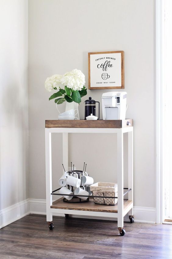 ركن القهوة يمكن أن يكون ببساطة عبارة عن طاولة قهوة متحركة. مع طاولة القهوة الأنيقة هذه، يمكنك تغيير مكان ركن الكوفي في أي وقت بسهولة.