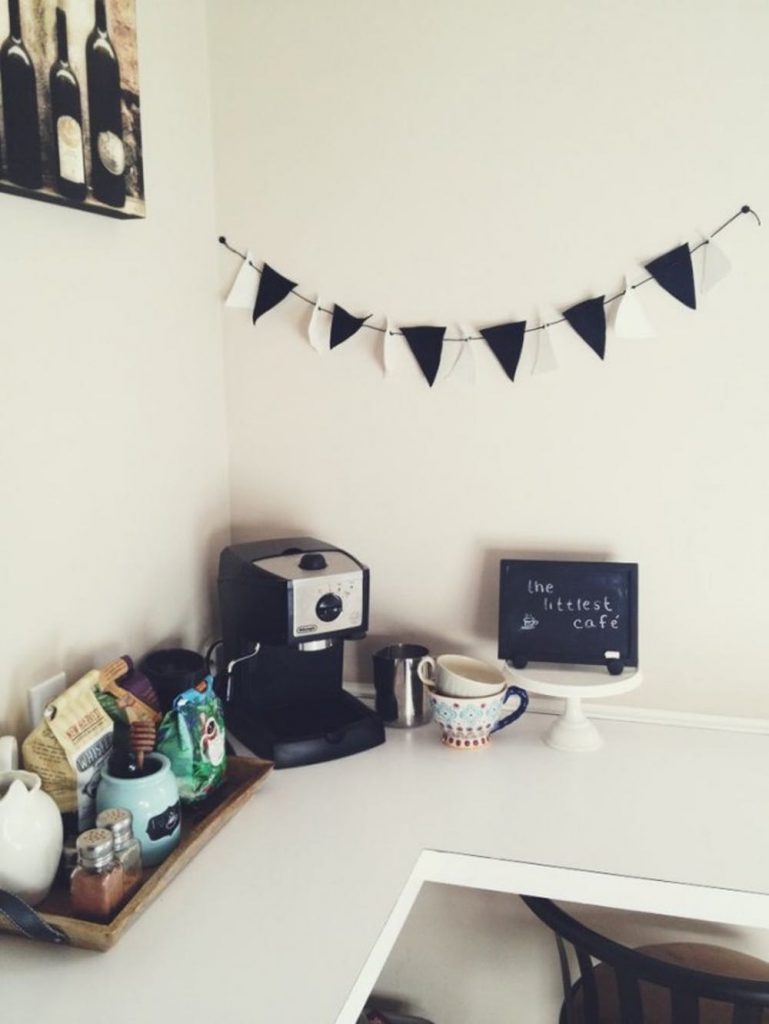 في ركن القهوة هذا، بالكاد كل شيء يتحلى باللون الأبيض، مما يمنح المكان شعورا دافئا بغض النظر عن أن المكان يبدو مزدحما قليلا. أيضا، هناك لوحة طبشور أخرى هنا. لوحات الطبشور هي خيار شائع جدا عندما يتعلق الأمر بركن القهوة.