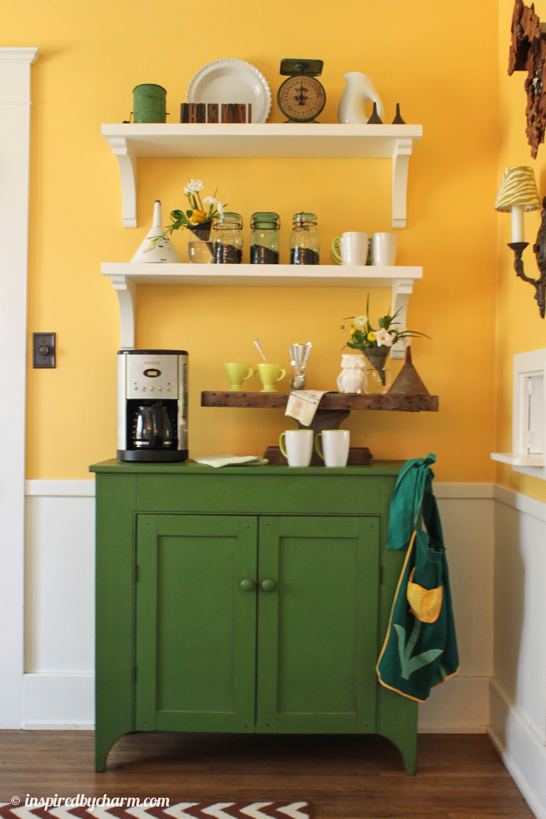 تبدو الشمس وكأنها تشرق على ركن القهوة هذا. للأشخاص الذين يفضلون الألوان الجريئة في ديكورات جدران منازلهم، اللون الأصفر هو اللون المثالي لركن القهوة في المطبخ. في هذا المثال، اللون الأخضر للخزانة يخدم وظيفة مهمة وهي التقليل من أثر اللون الأصفر الصارخ.