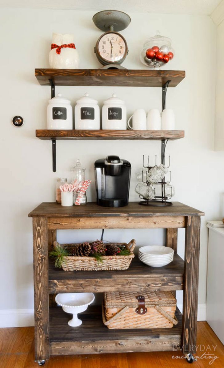 إذا كنت محدودا بمساحة ضيقة، هذه الفكرة قد تكون مثالية لك. كل ما تحتاجه لتطبيق هذه الفكرة هو مساحة إضافية على الحائط تجنبك تلك الفوضى على طاولة القهوة. العلب الصغيرة تبدو أكثر من رائعة بينما توفر مساحة لتخزين حبوب القهوة والشاي.