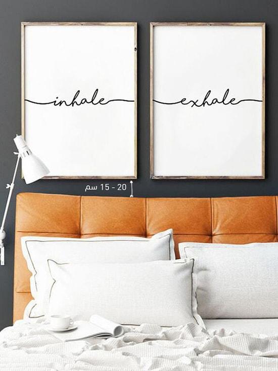 أيضا يمكنكم تعليق لوحتين فنية جنبا إلى جنب بحيث يشكل عرض كل منهما ثلث العرض الكلي لقطعة الكنب أي عرض اللوحة الواحدة يكون 0.65 سم مع مراعاة ترك مسافة أفقية بين 2.5 سم و 5 سم بين اللوحتين.