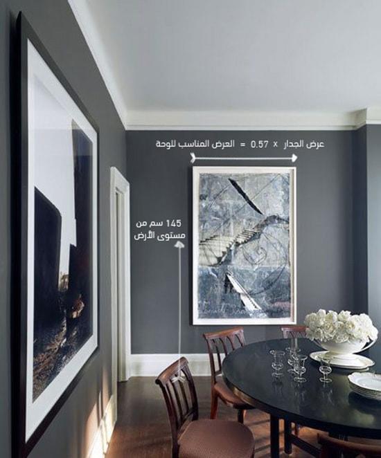 بهذا الإرتفاع, سوف يكون منتصف اللوحة موازي لمستوى العين تقريبا. جدير بالذكر أيضا أن هذه القاعدة تطبق عموما في حالة عدم وجود قطع أثاث مركزية تحت اللوحة أو قريبة منها مثل قطعة كنب أو سرير.
