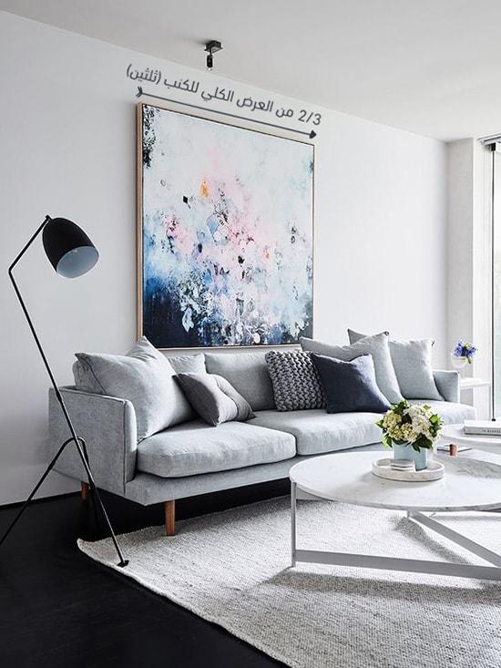 إذا كنت ترغب في تعليق اللوحة الفنية فوق قطعة كنب فيمكنك أن تختار عرض اللوحة الفنية بمقاس لا يقل عن ثلثي العرض الكامل لقطعة الكنب كما هو موضح في الصورة التالية: