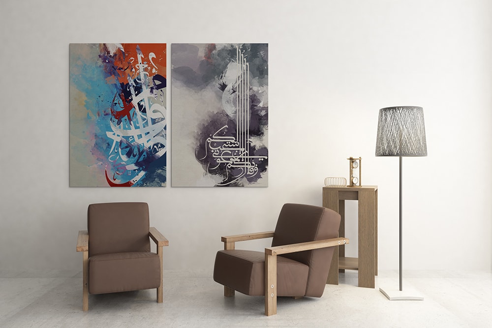 إذا كنت ترغب باقتناء لوحات فنية إسلامية بالخط العربي، ننصحك باقتناء التجريدية منها أو الحروفيات ذات الستايل العصري. احرص على انتقاء لوحات الخط العربي بألوان تتناسق مع الألوان الموجودة سابقا في غرفتك أو اختر لوحات خط عربي بألوان محايدة مثل الأبيض أو البيج أو غيرها.
