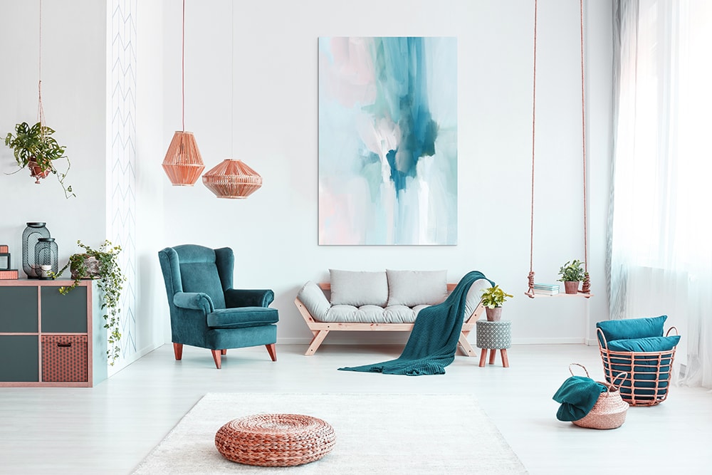 غالبا، التصميم المعقد للديكور الداخلي المنزلي بإمكانه أن يبدو مزدحما وفوضويا. حل بسيط لهذه المشكلة (خصوصا إذا كانت لديك الكثير من القطع داخل الغرفة) يكون بإضافة لوحة جدارية كبيرة لتكون هي النقطة المركزية داخل الغرفة.